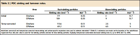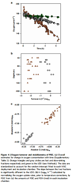 測量指標:使用Unisense微電極測量顆粒物耗氧速率,并結合POC含量計算出的碳比周轉速率 k(d?1)(圖4a, b和 表2)。