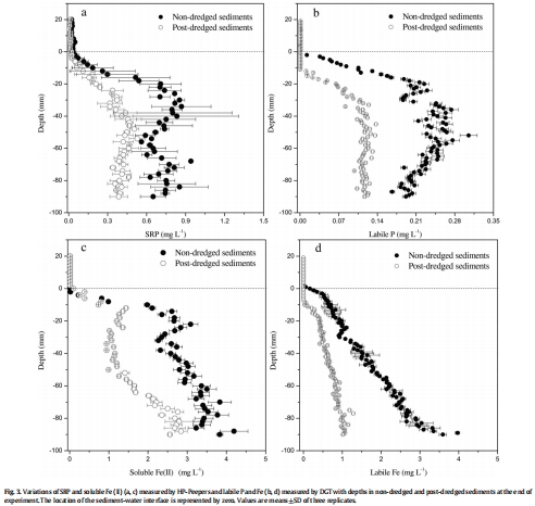 測量指標:使用HR-Peeper測量孔隙水中的可溶性反應(yīng)磷(SRP)和可溶性Fe(II)的垂直剖面;使用DGT測量活性磷(Labile P)和活性鐵(Labile Fe)的剖面。