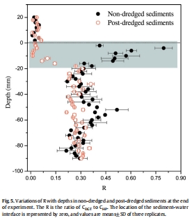 研究意義:圖5顯示,疏浚后沉積物表層的R值顯著降低(P < 0.001),表明疏浚削弱了沉積物固相磷向孔隙水的再供應(yīng)能力,即沉積物磷庫的“緩沖能力”下降。