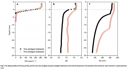 研究意義:圖2a-c顯示,疏浚后沉積物表層的氧滲透深度增加,Eh值升高,pH更趨于中性。這指示疏浚創(chuàng)造了更氧化的環(huán)境,有利于磷通過吸附到鐵氧化物上而被固定,從而抑制磷釋放。