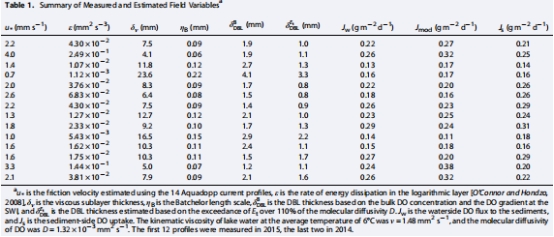 測量指標:使用ADCP測量的時間平均縱向流速(ū)垂直剖面,據此計算的摩擦速度(u)、能量耗散率(ε)、粘性底層厚度(δv)和 Batchelor尺度(ηB)。這些參數匯總于表1*。