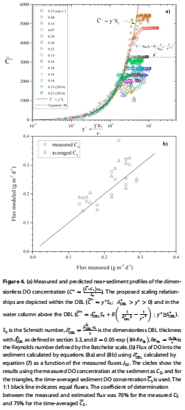 研究意義:圖4a顯示,新的標度律能很好地描述整個測量范圍內的氧氣剖面。圖4b表明,僅利用水動力參數和背景氧濃度通過新模型預測的通量(J_mod)與直接測量得到的通量(J_w, J_s)高度一致(R2 ~ 0.7-0.75)。這強有力地證明了所提出標度律的有效性和實用價值,意味著在缺乏微剖面數據時,可通過較易獲得的流速數據來可靠估算沉積物氧消耗。