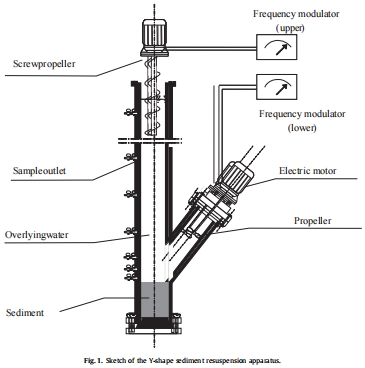 實(shí)驗(yàn)設(shè)計(jì):使用專利的Y形沉積物再懸浮裝置(圖1)來(lái)模擬真實(shí)湖泊中的風(fēng)浪過程。實(shí)驗(yàn)設(shè)置了對(duì)照組(未處理)、Phoslock®處理組、NCAP700覆蓋組(材料覆蓋在沉積物表面)和NCAP700混合組(材料與表層2厘米沉積物混合)。