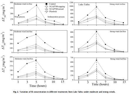 研究意義:這些數(shù)據(jù)是評(píng)估沉積物穩(wěn)定性和再懸浮強(qiáng)度的直接指標(biāo)。圖2(太湖)和圖3(巢湖)清晰顯示,與對(duì)照組相比,所有地球工程材料處理均顯著降低了SS濃度,表明材料添加增強(qiáng)了沉積物抗侵蝕能力。其中,NCAP700覆蓋處理的效果最穩(wěn)定。這些數(shù)據(jù)證實(shí)了材料本身對(duì)沉積物物理結(jié)構(gòu)的穩(wěn)固作用,這是其能長(zhǎng)期有效控磷的物理基礎(chǔ)。