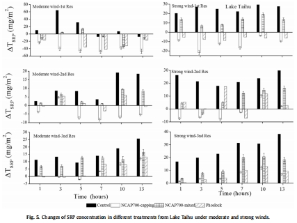 研究意義:這是評(píng)價(jià)地球工程材料控磷效率的核心指標(biāo)。圖5(太湖)和圖6(巢湖)表明,所有材料處理都顯著降低了上覆水SRP濃度。圖7進(jìn)一步顯示,材料處理顯著降低了從沉積物向上覆水釋放磷的通量。Phoslock® 在大多數(shù)情況下表現(xiàn)最優(yōu)。這些數(shù)據(jù)直接證明了材料在動(dòng)態(tài)條件下控制內(nèi)源磷釋放的有效性,同時(shí)也顯示其效率會(huì)隨著再懸浮次數(shù)增加而有所下降。