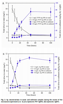 研究意義:這些數(shù)據(jù)證實了AgNPs會快速聚集、沉降并在表層沉積物(<5 mm)中大量積累(圖2)。這是AgNPs能夠?qū)Φ讞⑸锂a(chǎn)生直接作用的前提。同時,數(shù)據(jù)顯示PVP涂層能提高AgNPs的穩(wěn)定性,減緩聚集,并顯著降低銀離子的釋放。