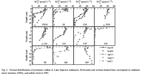 測(cè)量指標(biāo):蘇必利爾湖多個(gè)站點(diǎn)沉積物孔隙水中硫酸鹽(SO?2?)濃度隨深度的變化。