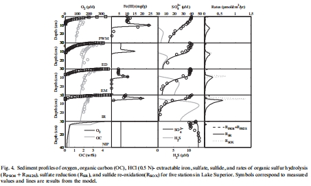 研究意義:圖4將這些速率與實(shí)測(cè)的氧氣、硫酸鹽等剖面一同展示。該圖直觀地揭示了沉積物內(nèi)部硫循環(huán)的“引擎”是如何工作的。例如,它顯示有機(jī)硫的礦化(產(chǎn)生SO?2?和H?S)主要發(fā)生在沉積物表層的氧化層,而硫酸鹽還原則發(fā)生在更深的缺氧區(qū)。這些模擬數(shù)據(jù)將宏觀的硫酸鹽剖面與微觀的生物地球化學(xué)過程聯(lián)系起來,闡明了有機(jī)硫驅(qū)動(dòng)內(nèi)部硫循環(huán)的完整路徑。