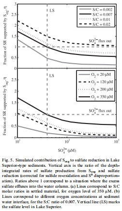 有機(jī)硫是低硫酸鹽環(huán)境中硫酸鹽還原的主要驅(qū)動(dòng)力:在硫酸鹽濃度低于500 μM的環(huán)境中,沉積物中有機(jī)硫的礦化可以貢獻(xiàn)超過50%的硫酸鹽還原所需底物。在蘇必利爾湖(~40 μM),沉積物甚至是硫酸鹽的凈來源,硫酸鹽還原幾乎完全由內(nèi)部產(chǎn)生的硫酸鹽支持。