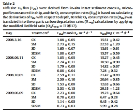 數據來源:表2(正文中“Diffusive O2 flux and organic carbon degradation rates”)。