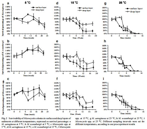 厭氧環(huán)境提供保護:在相同溫度下,深層厭氧沉積物中的微囊藻存活率顯著高于表層好氧沉積物。厭氧條件有效減緩了細(xì)胞的衰亡過程。