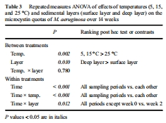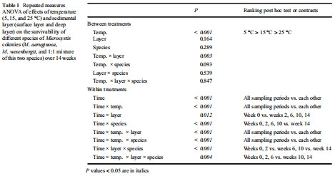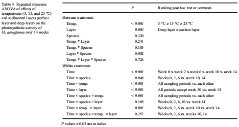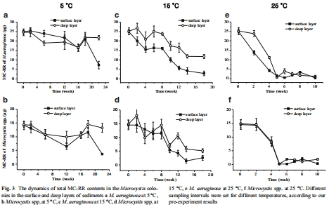 研究意義:這是最直接量化微囊藻在沉積物中存活能力的核心指標(biāo)。圖2清晰地展示了溫度、沉積層深度和藻種對存活率的巨大影響。數(shù)據(jù)顯示,低溫(5°C)和深層厭氧環(huán)境能極有效地維持微囊藻群體的存活,而高溫(25°C)和表層好氧環(huán)境則導(dǎo)致群體迅速消亡。這些數(shù)據(jù)首次在受控條件下系統(tǒng)揭示了溫度是決定底棲微囊藻存活期限的首要關(guān)鍵因子,并證實了厭氧環(huán)境的保護作用。