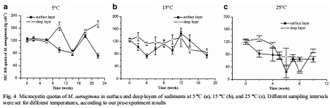 測量指標(biāo):總微囊藻毒素(MC)含量(沉積物中所有微囊藻細(xì)胞所含毒素總量)和毒素配額(平均每個細(xì)胞的毒素含量)。