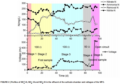 MFC構建與操作:使用雙室反應器(陽極和陰極體積各0.452 L),以碳刷為電極,Nafion 117膜分隔。陰極室通過曝氣控制DO,溫度從31°C逐步升至36–48°C。進水為合成廢水(COD 300 mg/L,NH??-N 480 mg/L),水力停留時間10.4小時。