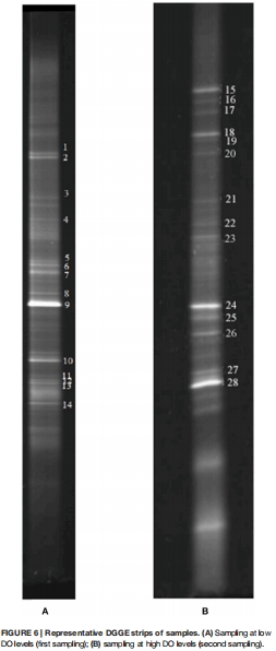 數據來源:圖6(caption: "Representative DGGE strips of samples")和表1-2(物種鑒定結果)。
