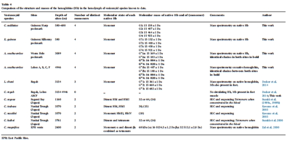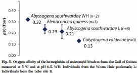 血紅蛋白特性與棲息地化學環境相關:具有最高氧親和力血紅蛋白的物種(C. valdiviae)占據了氧氣濃度最低的棲息地(Harp坑);而能夠分布在硫化物峰值最深棲息地的物種(A. southwardae),其血紅蛋白也具有很高的氧親和力,這有助于其在埋入深層、缺氧的沉積物中覓食硫化物時維持氧氣供應。