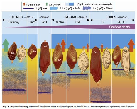 這篇發表于《Deep-Sea Research Part II》的論文核心探討了血紅蛋白的特性是否會影響囊螺科蛤蜊(vesicomyid clams)在深海富含硫化物沉積物中的分布。研究以安哥拉盆地(剛果河-安哥拉邊緣)為例,重點關注了三種蛤蜊物種:Calyptogena valdiviae, Elenaconcha guiness和 Abyssogena southwardae。研究發現,這三種蛤蜊都擁有四種分子量各不相同的單體血紅蛋白,且都具有極高的氧親和力(P50低于1 Torr),但彼此之間存在顯著差異。其中,生活在氧氣濃度最低的棲息地(Harp坑)的 C. valdiviae具有最高的氧親和力。研究認為,血紅蛋白的特性確實有助于蛤蜊在硫化物豐富的沉積物中進行活躍的垂直分布。