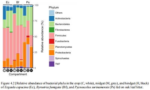 測量指標:16S rRNA基因測序獲得門水平和屬水平相對豐度數據。例如,Figure 4.2顯示垃圾取食蟑螂后腸以厚壁菌門(Firmicutes)和擬桿菌門(Bacteroidetes)為主,而木材取食物種后腸中纖維桿菌門(Fibrobacteres)比例較高。