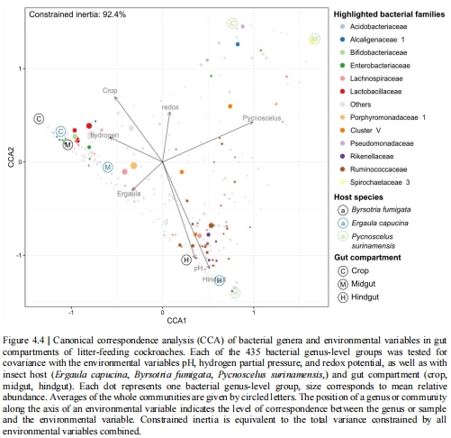 數據來源:Figure 4.4(caption: "Canonical correspondence analysis of bacterial genera and environmental variables")。