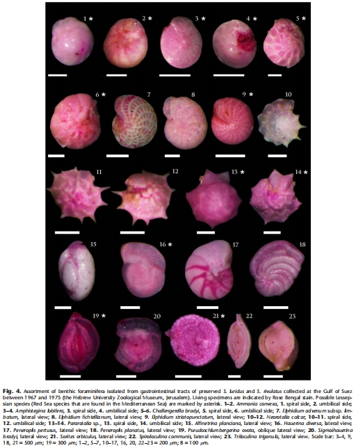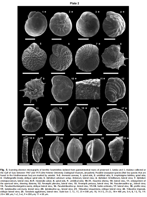 研究意義:提供了歷史性證據,表明這種傳播機制在幾十年前(早于1967年)就已經在紅海原生地發揮作用。這證明魚類傳播并非偶然現象,而是一種長期存在的、有效的自然傳播途徑。共發現34種有孔蟲。
