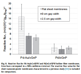 研究意義:這是評(píng)估膜催化性能的核心量化指標(biāo)。數(shù)據(jù)清晰表明,Pd-Au/xGnP/PSf膜的反應(yīng)通量顯著高于Pd/xGnP/PSf膜(文檔圖8),直接證明了雙金屬催化劑在膜反應(yīng)器構(gòu)型下的優(yōu)越性。此外,空氣間隙對(duì)反應(yīng)通量無(wú)顯著影響,說(shuō)明催化活性主要取決于催化劑本身而非膜形態(tài)的微小差異。