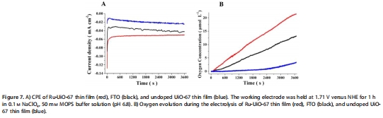 研究意義:定量評估Ru-UiO-67薄膜作為水氧化催化劑的核心性能指標。結果顯示,在1.71 V(vs. NHE)電位下電解1小時,Ru-UiO-67薄膜的氧氣產量是未摻雜UiO-67薄膜的5倍,其法拉第效率高達(55±6)%(文檔圖7A, B)。這些數據直接、有力地證明了嵌入MOF的釕催化劑是有效的活性中心,且該復合薄膜具有優異的催化選擇性和活性。