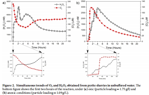 核心實驗:實時、原位監測:研究的核心是使用高靈敏度、快速響應的安培微傳感器(H?O?傳感器和O?傳感器),在批次反應器中連續監測黃鐵礦懸浮液里H?O?和O?濃度隨時間的變化。通過系統改變氧氣條件(有氧/無氧)和黃鐵礦投加量,獲取不同場景下ROS生成的動力學曲線。