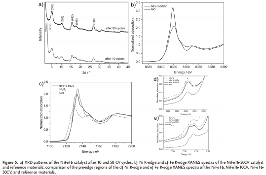 性能優勢:最優組分NiFe16在低過電位(240 mV)和長穩定性(160小時)方面優于傳統氧化物/氫氧化物催化劑。