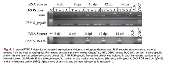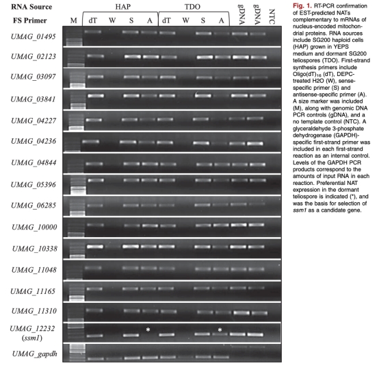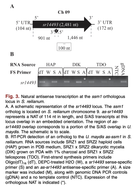 1. NATs表達(dá)模式:通過(guò) strand-specific RT-PCR 檢測(cè) as-ssm1 在冬孢子中的特異性表達(dá),以及其在植物感染時(shí)間過(guò)程中的出現(xiàn)時(shí)機(jī)。來(lái)自圖1、圖3、圖4。研究意義:證實(shí)NATs在休眠階段特異性表達(dá),支持其參與休眠調(diào)節(jié)的假說(shuō)。