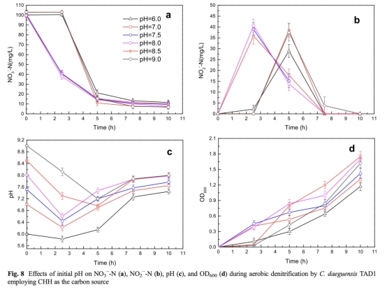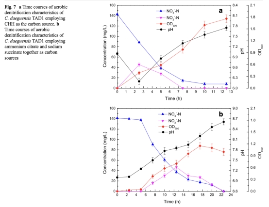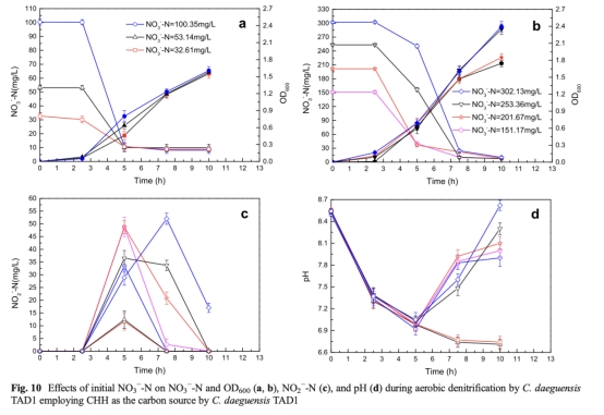 2 硝酸氮(NO3-N)和亞硝酸氮(NO2-N)濃度:用于計算反硝化速率和效率,數據來自圖7、8、10。研究意義是直接衡量TAD1菌的反硝化能力,證明CHH作為碳源的有效性。