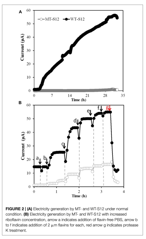 這篇論文研究了細菌胞外電子轉移(EET)過程中非細胞色素c蛋白(ENCP)的作用。盡管外膜c型細胞色素(OMCs)被認為是細菌EET所必需的,但大多數細菌缺乏OMCs,而在生物膜胞外聚合物中存在其他氧化還原蛋白。論文假設ENCP在電子介體促進下可能參與EET。通過比較野生型Shewanella decolorations S12和OMC缺陷突變體的發電能力,發現突變體在正常培養下無法發電,但添加核黃素后恢復至野生型26%的發電能力。生物電化學和X射線光電子能譜分析表明,ENCP如含Fe-S簇的蛋白參與了黃素介導的EET。