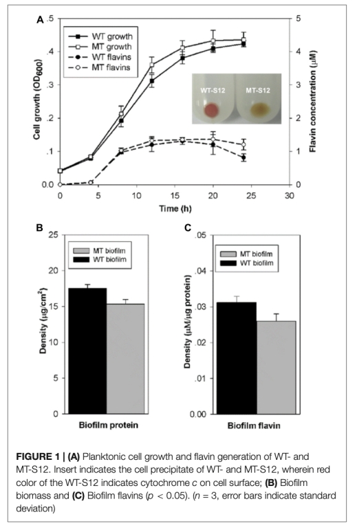 2 生物膜生長和黃素濃度數據:WT和MT生物膜厚度相似(約17μm),但MT生物量較低(15 vs 17.5μg/cm2),MT生物膜黃素分泌能力降低12.9%。這些數據來自圖1。研究意義:表明OMC缺失影響生物膜微環境適應性,但結構完整性保留,ENCP可能作為替代電子傳遞路徑。