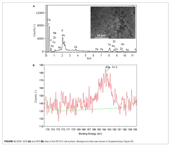 4 元素和化學鍵分析數據:EDS檢測到生物膜中Fe元素(WT 0.11%,MT 0.07%),XPS在163.5eV顯示Fe-S鍵特征峰。這些數據來自圖4。研究意義:證實ENCP中含Fe-S簇等氧化還原中心,可直接參與電子傳遞,支持ENCP在介導EET中的結構基礎。