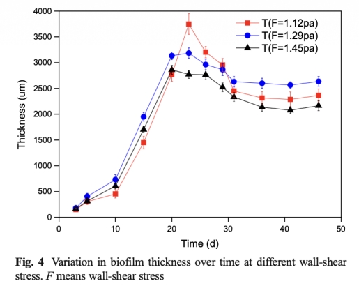 1 生物膜厚度:數(shù)據(jù)來自圖4,顯示生物膜厚度隨壁面剪切應(yīng)力變化,在1.29 Pa時(shí)最大(2.7±0.1 mm)。研究意義在于生物膜厚度影響傳質(zhì)過程,進(jìn)而調(diào)控微生物活性和降解效率。