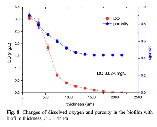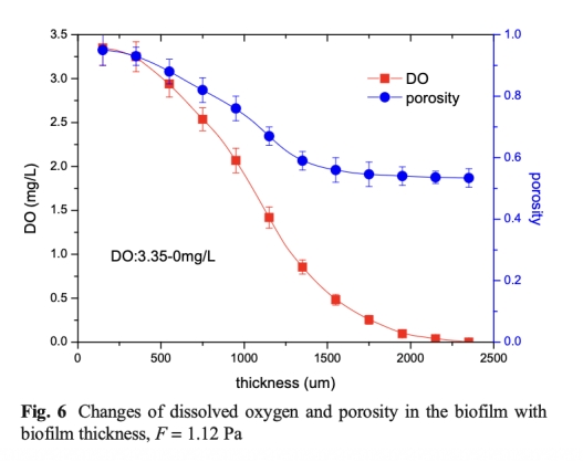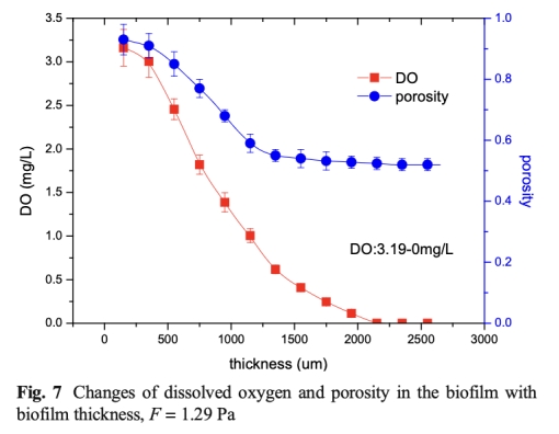3 溶解氧分布:使用丹麥Unisense電極測量,數(shù)據(jù)來自圖6、7、8,顯示溶解氧隨生物膜厚度增加而下降,在較高剪切應(yīng)力下氧氣滲透深度更淺。研究意義是溶解氧條件直接影響好氧和厭氧微生物的平衡,進(jìn)而影響群落結(jié)構(gòu)和功能。