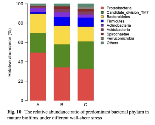 4 微生物群落結(jié)構(gòu):數(shù)據(jù)來自表2和圖10,通過高通量測序顯示主要菌門為Proteobacteria、Candidate_division_TM7和Bacteroidetes,其比例隨剪切應(yīng)力變化。研究意義是微生物多樣性差異反映了環(huán)境適應(yīng)性,與氧氣條件和孔隙率相關(guān),影響降解能力。
