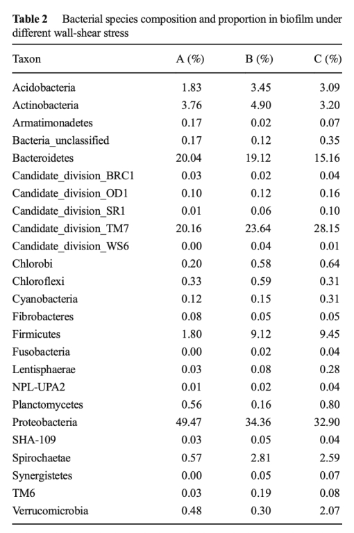 1 壁面剪切應(yīng)力顯著影響生物膜的物理和微生物結(jié)構(gòu),孔隙率隨剪切應(yīng)力增加而降低,微生物群落中Proteobacteria和Bacteroidetes比例減少,而Candidate_division_TM7增加。