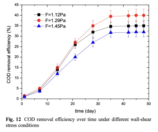 6 COD去除效率:數(shù)據(jù)來自圖12,顯示效率隨剪切應(yīng)力增加而降低(從40%到32%)。研究意義是COD去除效率綜合反映生物膜的整體性能,與孔隙率、OUR和微生物結(jié)構(gòu)協(xié)同作用,為下水道優(yōu)化設(shè)計(jì)提供依據(jù)。