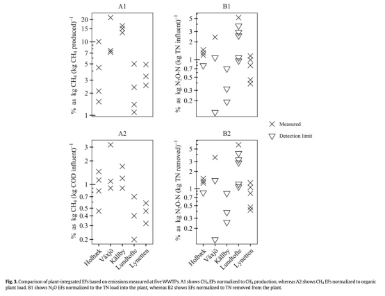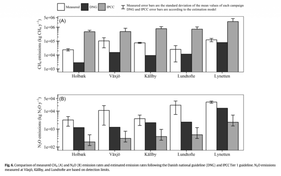 4 測量與指南估計值比較:數(shù)據(jù)來自圖6(測量與估計排放率比較),顯示IPCC Tier 1高估CH4排放(5-29倍),而丹麥指南低估排放。研究意義是驗證指南模型在國家尺度報告中的局限性,強調(diào)現(xiàn)場測量對站點特定報告的必要性。