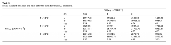 2. N2O排放因子數據:來自Fig. 7和Table 5。N2O排放隨RO變化呈現高度非線性行為,在低RO(NOB活性為零,亞硝酸鹽積累)和高RO(約0.65 mg COD/L,AOB反硝化速率最大)時出現峰值。研究意義在于明確了N2O排放的主要觸發條件是低氧水平導致的AOB與NOB活性失衡(引起亞硝酸鹽積累)以及特定中等氧濃度下AOB反硝化作用的增強。參數不確定性分析顯示N2O排放預測具有很高的不確定性。