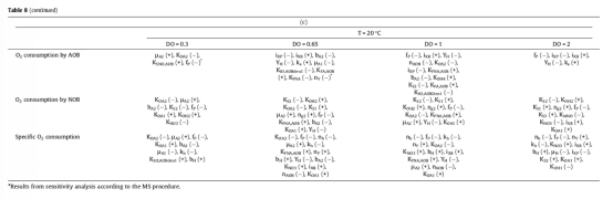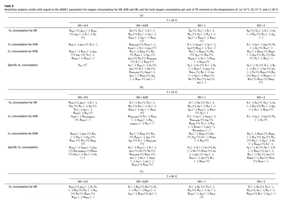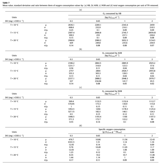 3. 微生物耗氧量數據:來自Table 7和Table 8。包括異養菌(HB)、AOB和NOB的耗氧量,以及單位總氮去除的比耗氧量。研究意義在于揭示了微生物間對氧氣的競爭關系,例如在低DO下,HB與NOB競爭氧氣;在高DO下,好氧HB活性會抑制NOB活性。這有助于理解操作條件如何影響微生物生態及其功能。