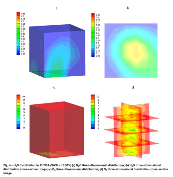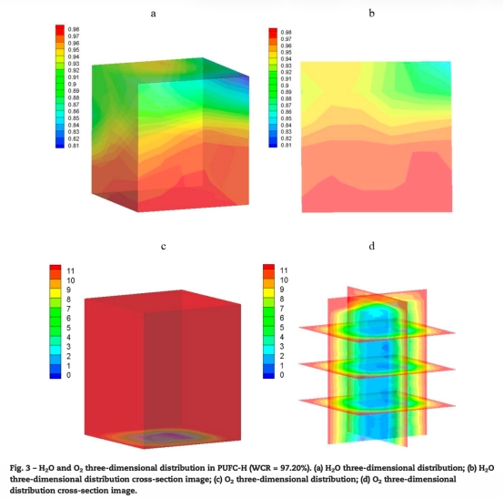 2. H2O分布數據:通過重力法測定PUFCs切片的水分含量率,三維模擬顯示水分分布不均勻,底部水分較高。數據來自Fig.3和Fig.4,其中Fig.3展示了高WCR(97.20%)PUFC的H2O和O2三維分布,Fig.4展示了低WCR(16.91%)的分布。研究意義:水分不均勻分布導致O2濃度變化,強調了控制填充材料水分均勻性的重要性,以避免局部缺氧或干燥,維持微生物活性。