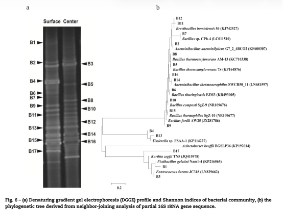 3. 微生物種群數據:通過PCR-DGGE分析PUFCs表面和中心的細菌群落,顯示表面為好氧細菌,中心為兼性厭氧細菌。數據來自Fig.6和Table 3,其中Fig.6展示了DGGE圖譜和系統發育樹,Table 3列出了細菌種類。研究意義:這些數據證實O2分布不均勻直接導致微生物種群分化,有助于理解生物過濾器中微生物的適應性,為調控微生物群落提高污染物降解效率提供指導。