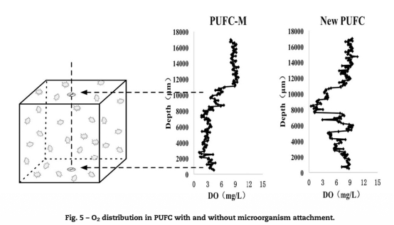 4. O2分布在有微生物附著的PUFCs中的數據:測量顯示PUFC-M中的O2濃度相對均勻但較低,中心區域O2濃度更低。數據來自Fig.5,比較了有和無微生物附著的PUFCs。研究意義:表明微生物呼吸消耗O2,影響微環境,突出了在生物過濾器運行中監測O2動態的重要性。