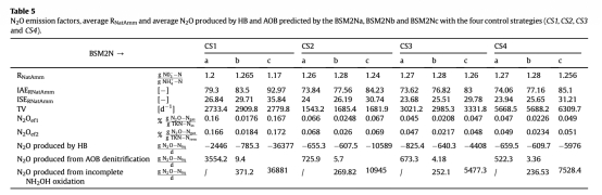 4 不同控制策略下的N2O路徑貢獻數據:來自Table 5。數據顯示了在不同控制器配置下,由AOB反硝化、不完全羥胺氧化和HB反硝化產生的N2O量。研究意義在于驗證了控制器在抑制主要N2O生產途徑(尤其是AOB反硝化)方面的有效性,并揭示了控制器性能對主導N2O生產機制的依賴性。