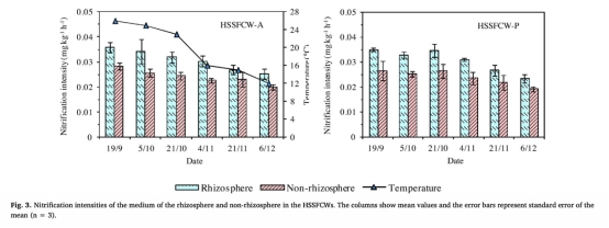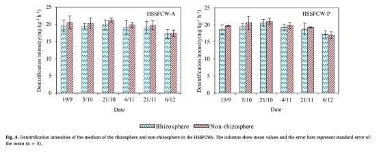 2 硝化和反硝化強度數據:來自Fig.3和Fig.4,顯示根際和非根際的硝化強度(NH4+-N氧化)和反硝化強度(NO3--N還原)。研究意義在于表明根際硝化強度顯著高于非根際,而非根際反硝化強度較高,突出植物根系釋氧創造好氧微環境促進硝化,而非根際缺氧條件利于反硝化,深化對濕地內部氮轉化空間分異的理解。