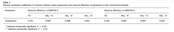 5 溫度相關性數據:來自Table 1,顯示水溫與NH4+-N、NO3--N去除效率的Pearson相關系數。研究意義在于證實溫度正相關于脫氮效率,水溫降低時硝化速率下降,指導濕地季節性運行策略。