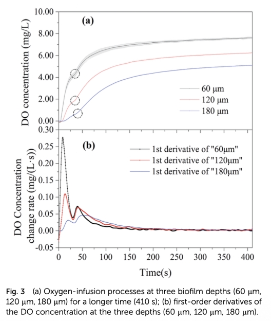 1 氧濃度隨時間變化的動態數據:測量了生物膜不同深度處的溶解氧濃度隨時間的變化,來自Fig. 2和Fig. 3。研究意義是首次揭示災變點現象,表明微生物活動導致DO變化率突變,為識別氧限制轉化為生物量限制的關鍵點提供依據。