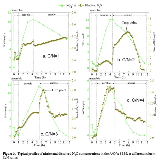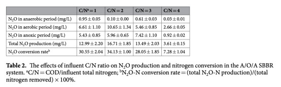 2 N2O在厭氧、好氧和缺氧期的產(chǎn)量數(shù)據(jù),來自Table 2。研究意義是量化不同階段N2O貢獻(xiàn),表明好氧期是主要排放源(如C/N=2時10.65mg/L),且C/N=2時總排放最高(16.71mg/L),幫助識別關(guān)鍵控制環(huán)節(jié)。