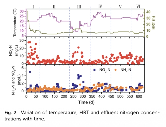 1 硝酸鹽去除效率和反硝化速率數據:測量了不同溫度下出水硝酸鹽濃度和反硝化速率,來自圖2和表1。研究意義是證實PBS反硝化系統在長期運行中保持高去除率(88-97%),但溫度降低時性能下降,突出溫度控制的重要性,為工藝優化提供依據。